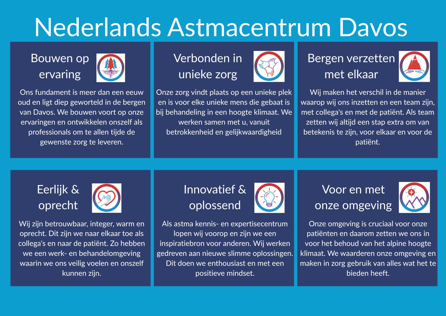 Unieke locatie, uniek behandelconcept Het Nederlands Astmacentrum Davos (NAD) ligt op 1686 meter hoogte in de Zwitserse bergen. Met 125 jaar ervaring een unieke werkplek met een uniek behandelconcept. Als enige van de zes Nederlandse klinische longrevalidatiecentra richt het NAD zich de afgelopen 30 jaar op één specifieke doelgroep: patiënten met ernstig astma. Hiermee is het NAD één van de Nederlandse expertisecentra op het gebied van ernstig astma. Zowel nationaal als internationaal is het NAD goed ingebed in het ernstig astma netwerk en werkt samen met meerdere partners op het gebied van MDO’s, opleiding & onderwijs en research.